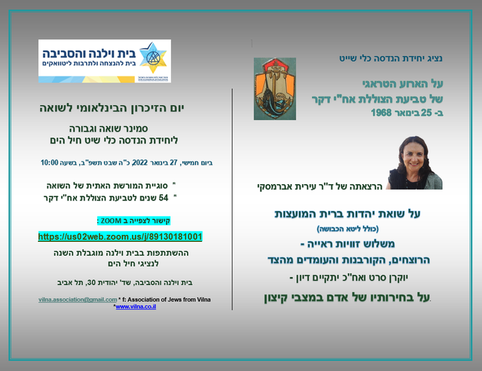 -ד"ר עירית אברמסקי הירצתה על שואת יהדות ברית המועצות (כולל ליטא הכבושה) משלוש זוויות ראייה-הרוצחים, הקורבנות והעומדים מהצד. הוקרן סרט קצר והתקיים דיון בנושא בחירותיו של אדם במצבי קיצון.