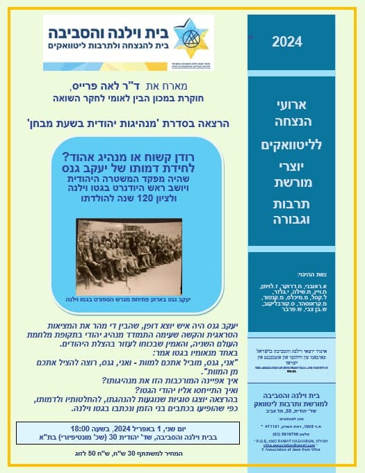 ד"ר לאה פרייס, חוקרת בדימוס ביד ושם, מחברת ועורכת ספרים הרצתה באפריל 2024 על יעקב גנס, יו"ר היודנראט בגטו וילנה. על עמידתו האיתנה מול הגרמנים בגטו ועלהאמונתו כי אסור להרכין ראש. על גנס כאדם פופולארי שאפשר לסמוך עליו. על אקציית 84 הזקנים ב-17 ביולי 1942, על הגנתו על חיי הילדים בגטו, על האקציה בגטו של העיירה אושמיאנה ב-27 באוקטובר 1942, על מורכבות תפקידו ועל הדילמות בפניהן עמד עד להריגתו ע"י הגרמנים זמן קצר לפני חיסול הגטו ב 1943.