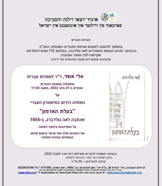 בסוף יוני 2023 התכנסנו לאסיפה כללית בבית וילנה. לאחר האסיפה שמענו את הרצאתו של אלי אשד על לאה גולדברג והמחזה שכתבה 'בעלת הארמון'.
