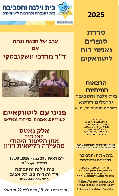 בסוף מרץ 2025, התכנסנו בבית וילנה להרצאה שכולה אימרות כנף, בדיחות יהודיות, משלים וסיפורי עם מהעיירות בליטא בהגשתו של  ד"ר מרדכי יושקובסקי. הנוכחים בילו ערב נעים ומשעשע.